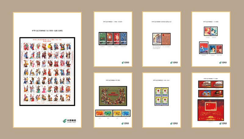第三展柜展示的是建國(guó)題材郵票,在這里我們看到的是《中華人民共和國(guó)成立五十周年——民族大團(tuán)結(jié)》郵票,全套56枚在一個(gè)版上,表現(xiàn)了56個(gè)民族身著民族盛裝、載歌載舞,迎接共和國(guó)五十周年大慶的場(chǎng)景,這套郵票是迄今為止我國(guó)發(fā)行枚數(shù)最多的一套郵票。
