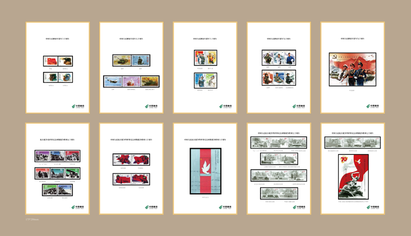 第四展柜展示的是人民軍隊(duì)題材郵票,包括三套抗戰(zhàn)郵票和四套建軍郵票。在這里我們看到的有2015年9月3日發(fā)行的《中國(guó)人民抗日戰(zhàn)爭(zhēng)暨世界反法西斯戰(zhàn)爭(zhēng)勝利七十周年》紀(jì)念郵票,全套13枚郵票和1枚小型張。