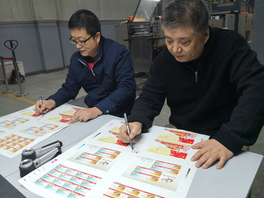 11月29日得知郵票圖稿通過審查即將下廠的消息,制作團隊拿出早已提前準備好的生產(chǎn)方案,但是擺在眼前的就是嚴重不足的生產(chǎn)和發(fā)運周期,按常規(guī)生產(chǎn)必定不能滿足發(fā)行要求。各生產(chǎn)環(huán)節(jié)的負責(zé)人齊刷刷坐在會議室里研究,一個又一個方案都被否決,必須突破常規(guī),從哪里著手?一個提議逐漸獲得越來越多人認可:將版式一、版式二、小型張三個品種同時刻在一個滾筒上,同時調(diào)圖刻版、打樣批樣,在后期按生產(chǎn)比例再加刻版式一、小型張滾筒補印,最大限度節(jié)省重復(fù)刻版和打樣時間。后加工能適應(yīng)這種方式嗎?印制團隊眼中閃著疑惑和思考,最終變成肯定。行,就這么干!