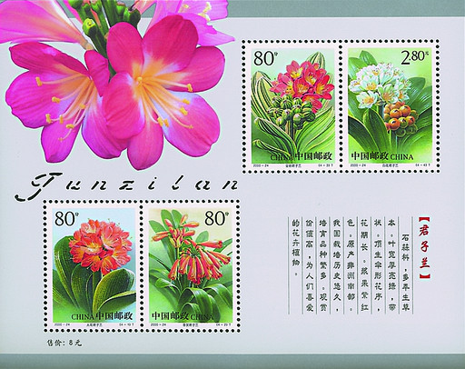 2000年12月12日,《君子蘭》特種郵票面世,小全張圖案為在淺灰色底襯托下,美麗的君子蘭栩栩如生,花的下方是一排精美的拼音文字鏤空設(shè)計(jì),這種在版面上的鏤空設(shè)計(jì)在國(guó)內(nèi)尚屬首次。