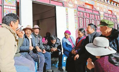 1月26日,在其美多吉鄰居拉姆措家院壩里,十幾位村民和干部正熱議其美多吉受表彰的事。