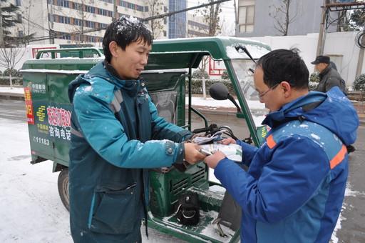 瑞雪兆豐年。1月中旬,一場大雪覆蓋了整個(gè)河南澠池。雨雪天氣里,道路濕滑難行,給百姓生活帶來不便。盡管這樣,澠池縣郵政分公司的投遞員們肩負(fù)著郵政普遍服務(wù)的職責(zé),踐行著“情系萬家 信達(dá)天下”的使命,他們不畏嚴(yán)寒,在風(fēng)雪中堅(jiān)守崗位,將郵件和報(bào)刊送至千家萬戶。圖為投遞員姜波在風(fēng)雪中投遞,將包裹及時(shí)送交給收件人。 □田丹丹 攝影報(bào)道