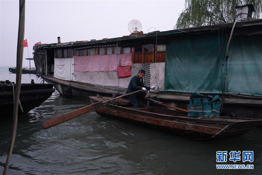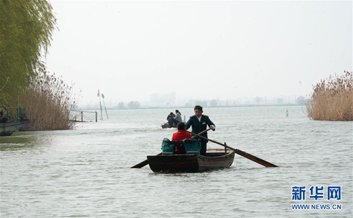 3月30日,唐真亞在洪澤湖上劃行。新華社記者 黃曉勇 攝