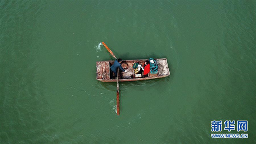 3月30日,唐真亞劃著小船和妻子閆玲前往新灘村送郵件(無人機(jī)拍攝)。新華社記者 季春鵬 攝