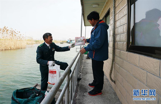唐真亞是江蘇省淮安市洪澤區(qū)老子山鎮(zhèn)郵遞員,今年55歲。整整20個年頭,唐真亞在水況復(fù)雜的洪澤湖上,攜帶郵件劃出了20萬公里的“水上郵路”,贏得湖區(qū)漁民的由衷贊譽(yù)。
