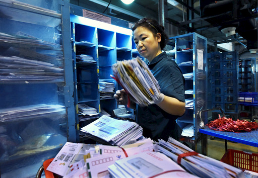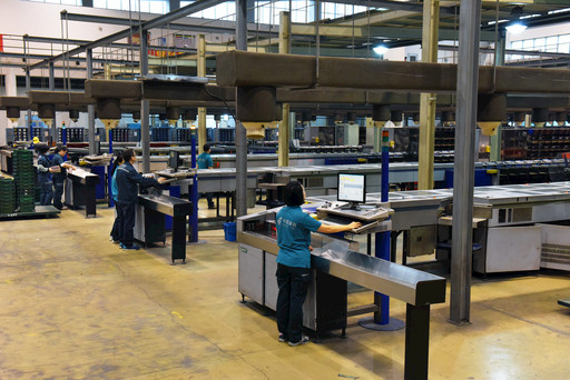 現(xiàn)代郵政自動化水平已經(jīng)很高,但手工分揀仍然是必要和有益的補充,圖為郵件處理中心外景。