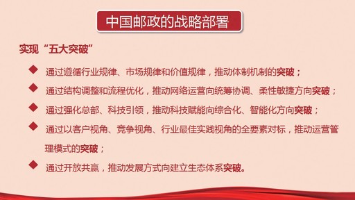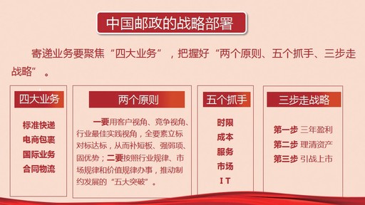 比如,對郵政寄遞業(yè)務(wù),我們的戰(zhàn)略部署就是要聚焦“四大業(yè)務(wù)”,把握好“兩個原則,五個抓手,三步走戰(zhàn)略”。
