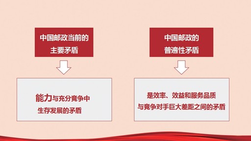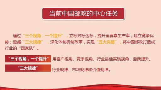 中國郵政當(dāng)前的主要矛盾是什么?黨課提出,是能力與充分競爭中生存發(fā)展的矛盾。除了普遍服務(wù)以外,我們的所有業(yè)務(wù)全部是充分競爭的行業(yè),可我們的競爭力卻并不容樂觀。大家可以認(rèn)真思考一下,我們寄遞業(yè)務(wù)的競爭力是什么?郵儲銀行的競爭力是什么?中郵保險的競爭力是什么?農(nóng)村電商有沒有競爭力?因此,中國郵政當(dāng)前的中心任務(wù)就是要通過“三個視角,一個提升”(客戶的視角、競爭的視角、行業(yè)最佳實(shí)踐的視角,自我提升),立標(biāo)對標(biāo)達(dá)標(biāo),提升全要素生產(chǎn)率,建立競爭優(yōu)勢;遵循“三大規(guī)律”(行業(yè)規(guī)律、市場規(guī)律、價值規(guī)律),深化體制機(jī)制改革,實(shí)現(xiàn)“五大突破”,將中國郵政打造成行業(yè)的“國家隊(duì)”?!叭绻瓿刹涣诉@個中心任務(wù),無論我們多么辛苦、多么努力,都將一事無成”。