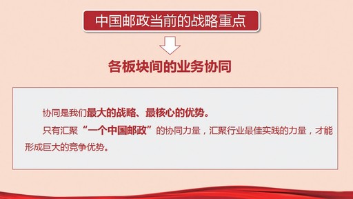 黨課關(guān)于中國郵政當(dāng)前的戰(zhàn)略重點(diǎn)就是“各板塊間的業(yè)務(wù)協(xié)同”這一論述,讓人印象深刻,既有立足現(xiàn)代中國郵政發(fā)展的歷史視野、大局格局,又體現(xiàn)了基于新時代,基于高科技、大數(shù)據(jù)廣泛運(yùn)用所帶來的新的危機(jī)與挑戰(zhàn)下的競爭力思考與選擇。黨課強(qiáng)調(diào),協(xié)同是中國郵政最大的戰(zhàn)略、最核心的優(yōu)勢。協(xié)同的作用是整體遠(yuǎn)遠(yuǎn)大于部分的簡單加總,但更多的時候是n次冪關(guān)系。只有匯聚“一個中國郵政”的協(xié)同力量,匯聚行業(yè)最佳實(shí)踐的力量,才能形成巨大的競爭優(yōu)勢。