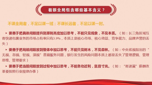 戰(zhàn)略目標(biāo)既定,中心任務(wù)已明,怎么落地?黨課不僅交任務(wù),也教方法,從著眼全局、突出重點(diǎn)、兼顧各方、照應(yīng)階段、抓住機(jī)遇、做好結(jié)合這6個方面詮釋了提升戰(zhàn)略思維能力的方法和步驟。時而引經(jīng)據(jù)典,時而對比國內(nèi)外同業(yè),黨課把高深的理論變?yōu)橥ㄋ滓锥闹v解。
