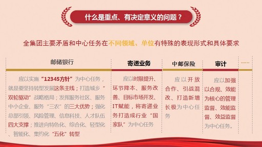 比如,郵儲銀行面臨哪些挑戰(zhàn)?寄遞業(yè)務(wù)面臨哪些挑戰(zhàn)?保險業(yè)務(wù)面臨哪些挑戰(zhàn)?我們的普遍服務(wù)面臨哪些挑戰(zhàn)?了解了這些主要矛盾,還要明確解決的方案和具體措施,明確我們的中心任務(wù)。比如對郵儲銀行,我們提出要以實(shí)施“12345”的工作思路作為中心任務(wù),就是要堅持轉(zhuǎn)型發(fā)展這條主線,打造城鄉(xiāng)“雙輪驅(qū)動”戰(zhàn)略格局,發(fā)揮服務(wù)社區(qū)、服務(wù)中小企業(yè)、服務(wù)“三農(nóng)”的三大優(yōu)勢,強(qiáng)化總部引領(lǐng)、風(fēng)險管理、信息科技、人才隊(duì)伍四大支撐,推進(jìn)向特色化、綜合化、輕型化、智能化、集約化“五化”轉(zhuǎn)型;對寄遞業(yè)務(wù),要以“時限提升、環(huán)節(jié)降本、服務(wù)改善、目標(biāo)市場開發(fā)、IT賦能”的思路,將寄遞業(yè)務(wù)打造成“國家隊(duì)”作為中心任務(wù);對中郵保險,要以開放合作、引戰(zhàn)混改、打造成新的增長極作為中心任務(wù)。還有審計工作,要以加強(qiáng)以合規(guī)、效能為核心的管理監(jiān)督、效能監(jiān)督、效益監(jiān)督為中心任務(wù)。