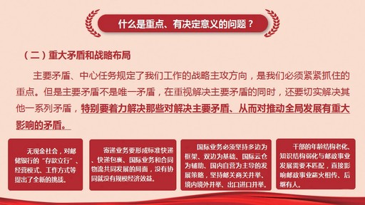 那么,中國郵政的普遍矛盾又是什么?黨課認(rèn)為是效率、效益和服務(wù)品質(zhì)與競爭對手巨大差距之間的矛盾,所有的板塊都存在著這樣一個普遍性的矛盾。所以,我們一定要知道矛盾的普遍性、矛盾的特殊性,抓住了主要矛盾這個牛鼻子,其他問題就迎刃而解。我們要堅決貫徹落實(shí)好新發(fā)展理念,堅持質(zhì)量第一、效益優(yōu)先,這是中國郵政行動的指南。