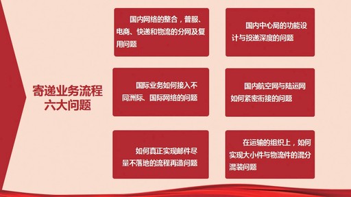 我們現(xiàn)在在流程方面主要有六大問題,大家一定要認(rèn)真研究解決。一是國內(nèi)網(wǎng)絡(luò)的整合,普服、電商、快遞和物流的分網(wǎng)及復(fù)用問題。哪些地方需要分網(wǎng)?是基于流量還是基于客戶不同的需求?到底怎么辦?德國郵政DHL有完全獨(dú)立的四大公司,是四個獨(dú)立的法人,但是DHL在德國農(nóng)村仍然是一個網(wǎng)絡(luò)服務(wù),我們怎么辦?二是國內(nèi)中心局的功能設(shè)計與投遞深度的問題。要研究是不是需要一個個孤立的分揀中心,然后經(jīng)過三次、四次分揀,不停落地?要不要集包?能不能直接分揀到段道口?三是國際業(yè)務(wù)如何接入不同洲際、國際網(wǎng)絡(luò)的問題。四是國內(nèi)航空網(wǎng)與陸運(yùn)網(wǎng)如何緊密銜接的問題。DHL在萊比錫有一個分揀中心,他們的航運(yùn)中心一邊坐著陸運(yùn)的人,一邊坐著空運(yùn)的人,中間坐著所謂的管理層,天氣預(yù)報的大屏幕就在后面,一旦出現(xiàn)問題,比如哪個國際方向不能飛了,改陸路怎么改,幾個部門的人一協(xié)商,馬上進(jìn)行車輛調(diào)度,然后就可以從空運(yùn)轉(zhuǎn)陸運(yùn),同樣可以實(shí)現(xiàn)次日遞或者隔日遞。而我們南京集散中心,有沒有陸運(yùn)的人?空運(yùn)和陸運(yùn)怎么結(jié)合?不能因?yàn)樘焐洗騻€雷,飛機(jī)不能落地就不運(yùn)了,結(jié)果客戶寄的櫻桃爛了,草莓也爛了。五是如何真正實(shí)現(xiàn)郵件盡量不落地的流程再造問題,我們這里說的11個環(huán)節(jié)、18個過程,實(shí)際上還不止這些,中間還有幾次分揀。六是在運(yùn)輸?shù)慕M織上,如何實(shí)現(xiàn)大小件與物流件的混分混裝問題。這些問題都是影響我們生產(chǎn)效率的核心問題,大家一定要認(rèn)真研究解決。所以,我們說首先要解決“有人看、有人干”的問題,就是要讓大家多看報表、多找問題,然后研究解決改善的辦法。