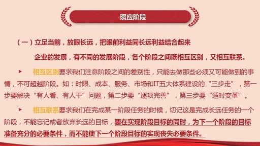 “照應(yīng)階段”一是立足當(dāng)前、放眼長遠(yuǎn),把眼前利益與長遠(yuǎn)利益結(jié)合起來。企業(yè)發(fā)展有不同的階段,每一個階段既相互區(qū)別,又相互聯(lián)系。