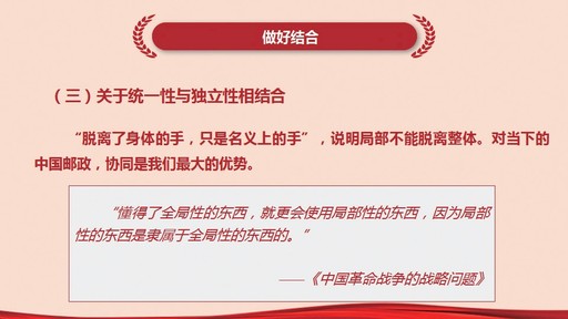 所謂戰(zhàn)略思維,就是關(guān)于實(shí)踐活動的全局性思維,是領(lǐng)導(dǎo)干部必備的素質(zhì)。黨課指出,只要有組織,就有組織工作的全局,凡是帶有統(tǒng)籌兼顧各方面、各階段、各類人性質(zhì)的工作,都是一個全局性的工作。集團(tuán)公司可以是工作的一個全局,一個省分公司也可以是工作的一個全局,一個地市分公司也可以是工作的一個全局。在企業(yè)發(fā)展中,各項(xiàng)工作都不是孤立的,一定是相互影響、相互促進(jìn)、相互受益的。中國郵政各級單位都是典型的具有全局性特點(diǎn)的組織,都需要協(xié)調(diào)好普遍服務(wù)、快遞物流、金融業(yè)務(wù)、農(nóng)村電商等各項(xiàng)業(yè)務(wù)發(fā)展工作。