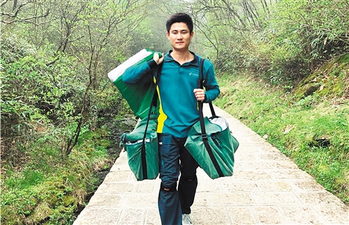 謝菲俊所在投遞班的班長(zhǎng)林鵬舉告訴記者,黃山風(fēng)景區(qū)內(nèi)山路崎嶇,無(wú)法行車(chē),每天都要人力背負(fù)重物翻山越嶺。謝菲俊一干就是3年多。