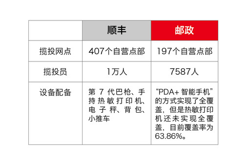 不只在網(wǎng)運方面,郵政在攬收、投遞等環(huán)節(jié)上與競爭對手也存在差距。從攬收能力上來說,以河北為例,順豐有攬投網(wǎng)點407個,郵政寄遞事業(yè)部有269個;順豐有一線攬投員1萬人,寄遞事業(yè)部有7587人。在設(shè)備配備方面,順豐配有第7代巴槍、手持熱敏打印機、電子秤、背包、小推車;河北郵政通過“PDA+智能手機”的方式實現(xiàn)了全覆蓋,但是熱敏打印機還未實現(xiàn)全覆蓋,目前覆蓋率為63.86%。(見圖表2)