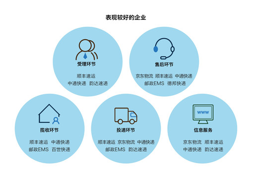 4月24日,國家郵政局發(fā)布了關(guān)于2019年第一季度快遞服務(wù)滿意度調(diào)查和時限準時率測試結(jié)果的通告,在快遞企業(yè)公眾滿意度方面,得分在80分以上的企業(yè)為順豐速運、京東物流,得分在76-80分之間的企業(yè)為郵政EMS、中通快遞、韻達速遞、申通快遞、圓通速遞和百世快遞。(見圖表3)在此之前,國家郵政局發(fā)布2018年快遞服務(wù)用戶滿意度、時限準時率調(diào)查結(jié)果。快遞企業(yè)總體滿意度排名依次為:順豐速運、郵政EMS、京東物流、中通快遞、韻達速遞、圓通速遞、百世快遞、申通快遞、德邦快遞、優(yōu)速快遞。在受理環(huán)節(jié)表現(xiàn)較好的企業(yè)有:順豐速運、中通快遞和韻達速遞;在攬收環(huán)節(jié)表現(xiàn)較好的企業(yè)有:順豐速運、中通快遞、郵政EMS、百世快遞;投遞環(huán)節(jié)表現(xiàn)較好的企業(yè)有:順豐速運、京東物流、中通快遞、郵政EMS、韻達速遞;售后環(huán)節(jié)表現(xiàn)較好的企業(yè)有:京東物流、順豐速運、中通快遞、郵政EMS和德邦快遞。信息服務(wù)方面表現(xiàn)較好的企業(yè)有:京東物流、順豐速運、中通快遞、韻達速遞。(見圖表4)