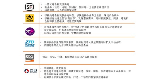 快遞企業(yè)在發(fā)展戰(zhàn)略中各有側重,而在共性中都包含了向綜合服務商的轉化、注重服務質量的提升以及科技賦能等方面(見圖表2)。