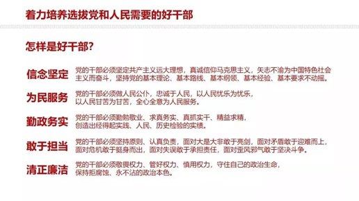習(xí)近平總書(shū)記強(qiáng)調(diào),好干部的標(biāo)準(zhǔn),大的方面說(shuō),就是德才兼?zhèn)?。同時(shí),好干部的標(biāo)準(zhǔn)又是具體的、歷史的。不同歷史時(shí)期,對(duì)干部德才的具體要求有所不同。