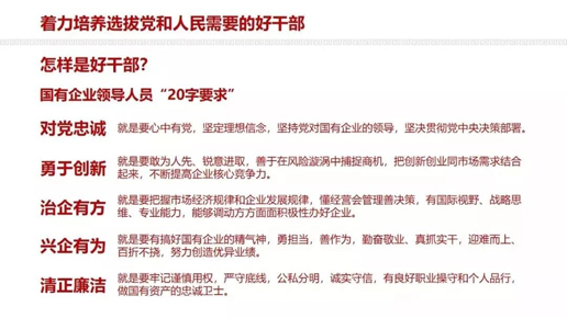 在全國(guó)國(guó)有企業(yè)黨的建設(shè)工作會(huì)議上,習(xí)近平總書(shū)記對(duì)國(guó)有企業(yè)領(lǐng)導(dǎo)人員提出了對(duì)黨忠誠(chéng)、勇于創(chuàng)新、治企有方、興企有為、清正廉潔的“20字要求”。劉愛(ài)力在領(lǐng)學(xué)時(shí)表示,中國(guó)郵政將習(xí)近平總書(shū)記對(duì)國(guó)有企業(yè)領(lǐng)導(dǎo)人員的“20字要求”作為選拔干部、培養(yǎng)干部、考核干部的根本遵循,嚴(yán)格貫徹執(zhí)行《黨政領(lǐng)導(dǎo)干部選拔任用工作條例》,堅(jiān)持好干部標(biāo)準(zhǔn),把政治標(biāo)準(zhǔn)放在第一位。