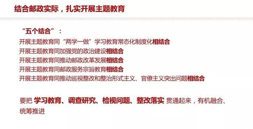 劉愛(ài)力提出,開(kāi)展主題教育要做到“五個(gè)結(jié)合”:開(kāi)展主題教育同“兩學(xué)一做”學(xué)習(xí)教育常態(tài)化制度化相結(jié)合,同加強(qiáng)黨的政治建設(shè)相結(jié)合,同推動(dòng)郵政改革發(fā)展相結(jié)合,同郵政服務(wù)宗旨教育相結(jié)合,同推動(dòng)巡視整改和整治形式主義、官僚主義突出問(wèn)題相結(jié)合。他深入闡述了如何將學(xué)習(xí)教育、調(diào)查研究、檢視問(wèn)題、整改落實(shí)貫通起來(lái),有機(jī)融合,統(tǒng)籌推進(jìn)。