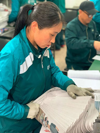 東四郵局投遞部的早晨是從7點開始的。砸郵戳、數(shù)報紙、分信件,忙而不亂。幾十斤重的一厚摞報紙砸到桌子上,只見他們右手一翻變成漂亮的扇面,左手拇指和食指一抬一壓快速掠過,轉(zhuǎn)瞬間每個人就數(shù)出了自己要送的報紙數(shù)量。