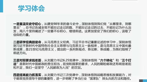 6月25日至30日,集團(tuán)公司利用6天時(shí)間,舉行“不忘初心、牢記使命”主題教育集中學(xué)習(xí)研討。中央第32指導(dǎo)組組長(zhǎng)王炳華、副組長(zhǎng)趙麗新等蒞臨指導(dǎo)。集團(tuán)公司黨組班子分章節(jié)領(lǐng)學(xué)《習(xí)近平關(guān)于“不忘初心、牢記使命”重要論述選編》《習(xí)近平新時(shí)代中國(guó)特色社會(huì)主義思想學(xué)習(xí)綱要》(以下簡(jiǎn)稱《選編》《綱要》)和習(xí)近平總書(shū)記有關(guān)重要講話精神等重要內(nèi)容,黨組書(shū)記、董事長(zhǎng)劉愛(ài)力結(jié)合領(lǐng)學(xué)內(nèi)容講授專題黨課。此次集中學(xué)習(xí)研討還邀請(qǐng)專家學(xué)者進(jìn)行專題輔導(dǎo),邀請(qǐng)行業(yè)領(lǐng)先企業(yè)就寄遞業(yè)務(wù)、金融業(yè)務(wù)改革發(fā)展進(jìn)行專題授課。各位學(xué)員認(rèn)認(rèn)真真聆聽(tīng)主題講授,并結(jié)合帶來(lái)的基層實(shí)踐案例、當(dāng)前迫切需要解決的關(guān)鍵問(wèn)題,積極參加研討,提出思考建議,共謀改革發(fā)展。