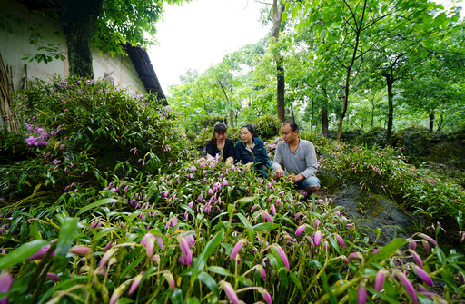穿過竹林,孫茂梅來到農(nóng)戶袁二妹家的石斛花田。蒼翠的樹叢間,粉紫色的石斛花滿山滿谷,一簇簇、一團(tuán)團(tuán),散發(fā)著淺淺的清香。