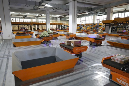 運轉(zhuǎn)中的郵政AGV搬運機器人。