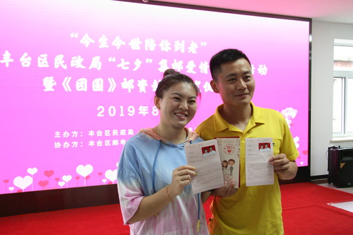 當天,豐臺區(qū)民政局與豐臺區(qū)郵政分公司聯合制作、特別推出了“今生今世陪你到老”紀念郵折,并首發(fā)一套主題為“十全十美”寓意的紀念郵戳,涵蓋“陪你到老”“愛由心生”“天作之合”“天長地久”“今生今世”“永結同心”“愛你一生”“情投意合”“相親相愛”“長相廝守”10個美好祝福詞。凡是當日到豐臺區(qū)民政局婚姻登記處領取結婚證的新人,都可以免費獲贈紀念郵折一套,并加蓋任意紀念郵戳?!捌呦κ俏覈o念愛情的傳統節(jié)日,選擇這一天領證對我們來說有著特殊的含義。我一直很羨慕父母輩的愛情,選一人伴一生,所以,這次我和他選擇了‘陪你到老’這枚郵戳,希望我們能白頭偕老?!碧锱空f。