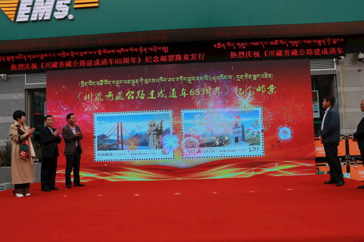 在首發(fā)儀式上,四川省分公司集郵與文化傳媒部副總經(jīng)理馮英為《川藏青藏公路建成通車六十五周年》紀(jì)念郵票隆重揭幕,集郵迷們期待已久的首發(fā)郵票正式揭開面紗。