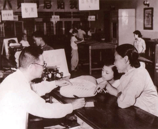 1958 年,東四郵局主動(dòng)改善服務(wù),資深營(yíng)業(yè)員于洪澤(左一),是在舊中華郵政工作過22 年的郵務(wù)佐,深信不能替用戶寫字的老規(guī)矩沒有錯(cuò),經(jīng)過服務(wù)思想教育,他告別了以前的自己,主動(dòng)為用戶填寫單式。
