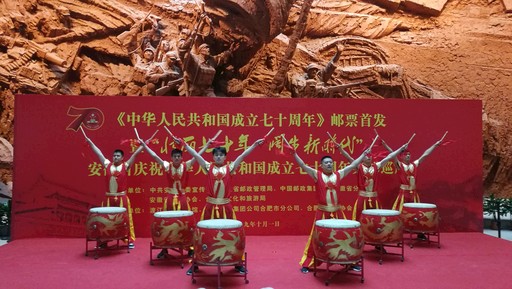 10月1日15時(shí),由中共安徽省委宣傳部、安徽省郵政管理局、安徽省郵政分公司、安徽省集郵協(xié)會(huì)、合肥市文化和旅游局主辦的《中華人民共和國(guó)成立七十周年》紀(jì)念郵票首發(fā)暨“壯麗七十年 闊步新時(shí)代”集郵巡展在渡江戰(zhàn)役紀(jì)念館舉行?;顒?dòng)中,安徽省分公司帶來了快閃表演《我和我的祖國(guó)》,全場(chǎng)同唱贊歌,歌頌祖國(guó)。圖為合肥市郵政分公司員工帶來的《鼓舞盛世 揚(yáng)帆遠(yuǎn)航》表演,強(qiáng)勁有力的鼓聲表達(dá)了慶祝新中國(guó)成立70周年的喜悅之情。(徐吉波 攝影報(bào)道)
