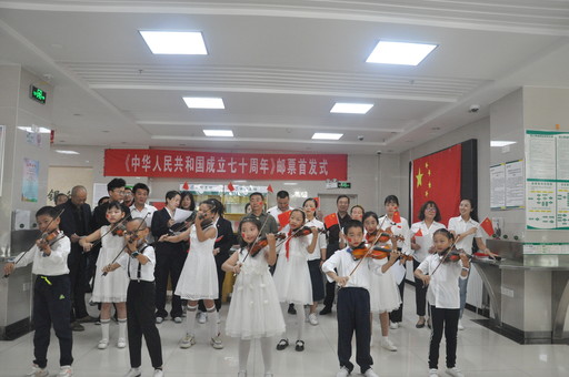舉國(guó)歡慶之際,山西省晉城市郵政分公司隆重舉行《中華人民共和國(guó)成立七十周年》紀(jì)念郵票首發(fā)活動(dòng)。10月1日上午,百余名集郵愛好者早早來到澤州路營(yíng)業(yè)廳前自覺排隊(duì),翹首期盼。8時(shí),首發(fā)活動(dòng)在晉城市分公司合唱隊(duì)慷慨激昂的《歌唱祖國(guó)》歌聲中開啟,兩位名為“國(guó)慶”的集郵愛好者被邀請(qǐng)為郵票揭幕?,F(xiàn)場(chǎng)還設(shè)立了臨時(shí)郵局,工作人員身著工裝,黨員佩戴黨徽,規(guī)范操作,有序引導(dǎo)。