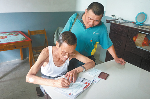 劉彩陸指導(dǎo)鐘福爐老人填寫(xiě)取款單。