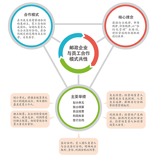 對(duì)郵政來(lái)說(shuō),將原來(lái)的合作客戶變成現(xiàn)在的郵政“合伙人”;對(duì)客戶而言,讓更多員工逐漸完成從原有企業(yè)執(zhí)行者到郵政企業(yè)經(jīng)營(yíng)者的角色轉(zhuǎn)變。雙方打破服務(wù)和被服務(wù)的關(guān)系,依據(jù)市場(chǎng)新變化,建立起寄遞業(yè)務(wù)經(jīng)營(yíng)端嵌入客戶生產(chǎn)線末端的“平臺(tái)+小微”模式,形成共同完成任務(wù),自主經(jīng)營(yíng)、自負(fù)盈虧、超利分成的“合約”關(guān)系,這就是山東郵政“合伙人”制。