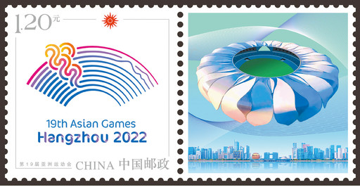 此次發(fā)行的個(gè)性化專用郵票1套1枚,另發(fā)行小本票1本。郵票主圖是杭州亞運(yùn)會(huì)會(huì)徽“潮涌”。會(huì)徽中的扇面造型反映江南人文意蘊(yùn),賽道代表體育競(jìng)技,互聯(lián)網(wǎng)符號(hào)契合杭州城市特色,太陽(yáng)圖形是亞奧理事會(huì)的象征符號(hào)。郵票附圖以杭州亞運(yùn)會(huì)主場(chǎng)館為主體,以錢塘江沿岸建筑作陪襯,藍(lán)綠底色寓意浙江的青山綠水和杭州山水城市的自然特質(zhì),運(yùn)動(dòng)感十足的水波紋象征著體育元素。郵票設(shè)計(jì)者馬立航老師特別強(qiáng)調(diào),錢江潮頭奔涌表達(dá)了勇立潮頭的精神氣質(zhì),整個(gè)郵票象征著新時(shí)代中國(guó)特色社會(huì)主義大潮的涌動(dòng)和發(fā)展,也象征亞奧理事會(huì)大家庭團(tuán)結(jié)攜手,緊密相擁,永遠(yuǎn)向前。