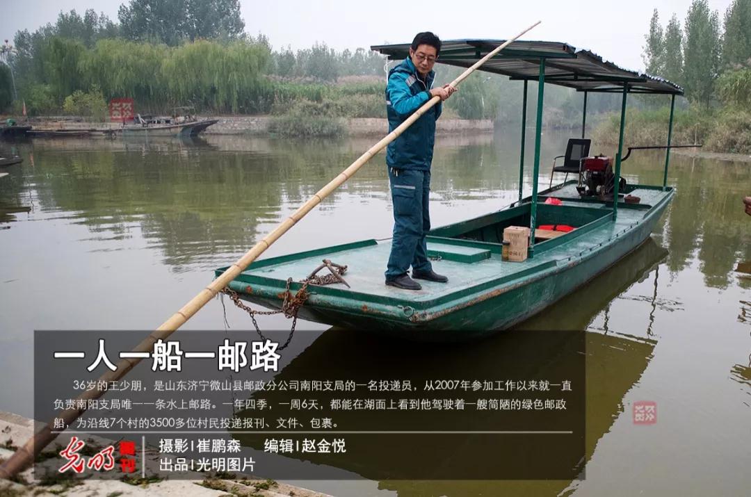 36歲的王少朋,是山東濟(jì)寧微山縣郵政分公司南陽支局的一名投遞員,從2007年參加工作以來就一直負(fù)責(zé)南陽支局唯一一條水上郵路。一年四季,一周6天,都能在湖面上看到他駕駛著一艘綠色郵政船,為沿線7個村的3500多位村民投遞報(bào)刊、文件、包裹。12年,他在這條水上郵路行駛了30多萬公里。