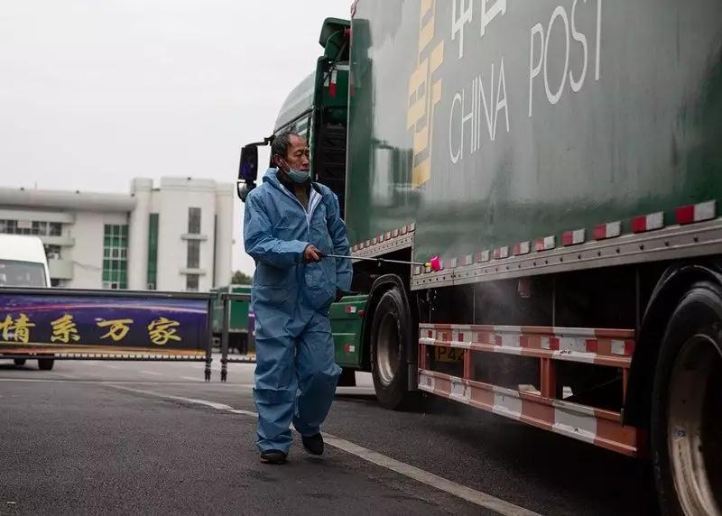 2月1日,武漢郵區(qū)中心局,工作人員噴灑稀釋的84消毒液為郵車消毒。來自全國各地經(jīng)郵政系統(tǒng)送來的救援物資抵達(dá)中心局就意味著到達(dá)了武漢,從大年三十開始,有專人每天對進(jìn)出車輛進(jìn)行噴灑消毒。
