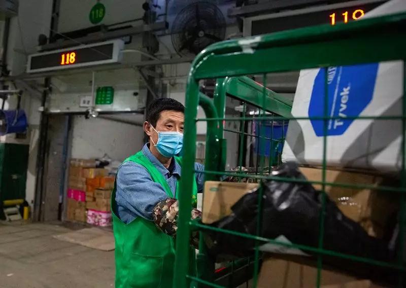 每天,綠色郵車不斷將物資匯集到位于武漢國際博覽中心的武漢市紅十字會臨時倉庫,來自多個郵政投遞點(diǎn)的工作人員幫助將物資卸車、分類。