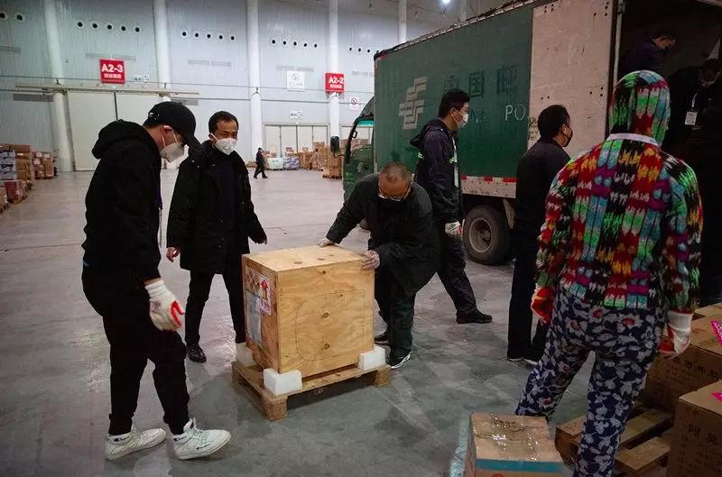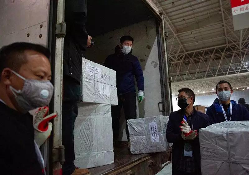 2月1日,武漢國際博覽中心,臨時被征用作倉庫的展廳內(nèi),現(xiàn)場志愿者和郵政工作人員從一輛中國郵政郵車上卸下一批來自杭州的醫(yī)療物資,其中包括PCR檢測系統(tǒng)等醫(yī)療設(shè)備。這里匯集了國內(nèi)外援助物資,來自武漢各個投遞點(diǎn)的郵政工作人員常駐現(xiàn)場,協(xié)助對物資進(jìn)行裝卸、分類和配送。