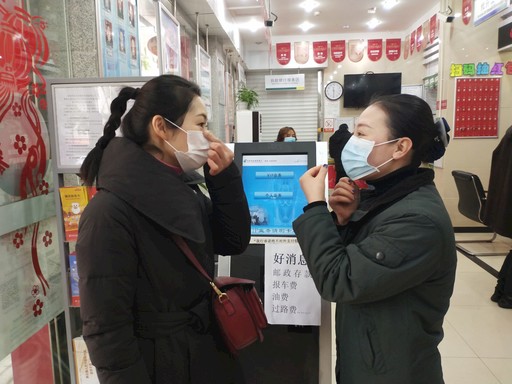 在四川省資陽市樂至縣公園路郵政營業(yè)大廳內(nèi),大堂經(jīng)理或?yàn)榭蛻魷y量體溫,或耐心指導(dǎo)客戶怎樣正確佩戴口罩,或向客戶講解防疫安全知識(shí),廳堂內(nèi)秩序井然。