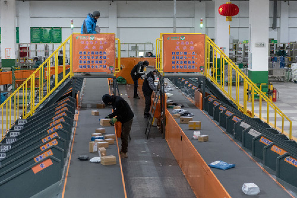 記者看到,在工作臺后,幾位身著中國郵政制服、佩戴口罩的工作人員分工明確,有序工作。有的人負責打包物品,有的人負責稱量包裹,還有的人正將貼好快遞單的郵件搬運上貨車。