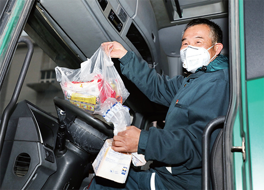 上海郵區(qū)中心局黨員駕駛員程勛江展示單位給他們準(zhǔn)備的食品,他全程要依靠這些“能量”將防疫援助物資運(yùn)達(dá)武漢。□許雨舟 攝影報(bào)道