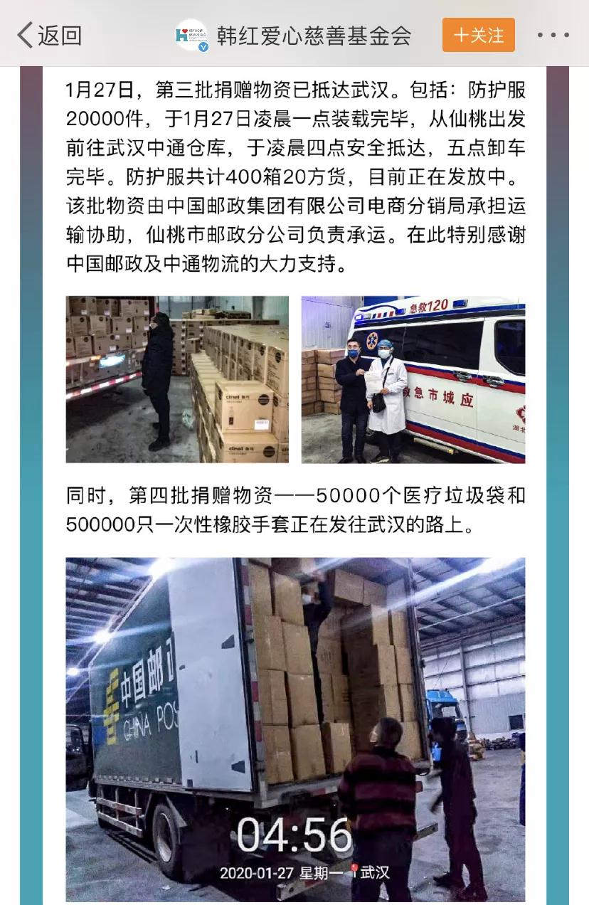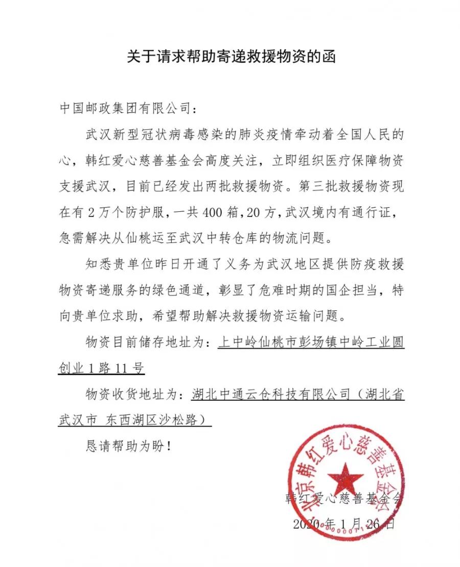 1月26日22時(shí),湖北郵政收到由中國(guó)郵政集團(tuán)有限公司轉(zhuǎn)發(fā),由北京韓紅愛(ài)心慈善基金會(huì)寄出的《關(guān)于請(qǐng)求幫助寄遞救援物資的函》。
