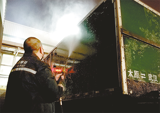 山西省太原郵區(qū)中心局員工為武漢返程郵車噴灑消毒液。 武亞亮 攝