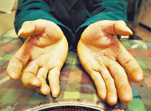 總幫客戶拆快遞包裝,加上天氣多風、投遞量大,貴州省都勻市郵政分公司攬投員彭光徳雙手干裂發(fā)黃。 聶悠瑞 攝