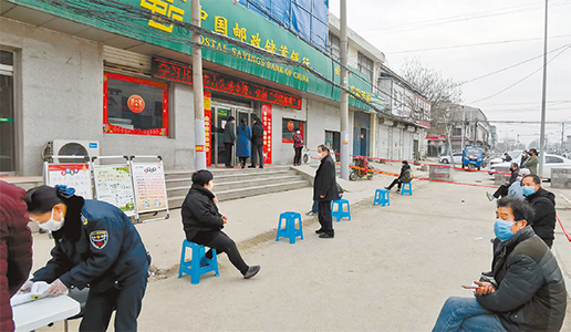 山東菏澤郵政農(nóng)村支局在營業(yè)廳外設立等待專區(qū),客戶測量體溫并消毒后方可進入廳堂辦理業(yè)務。 李慶昌 提供