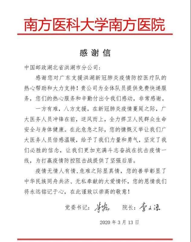 “感謝您對廣東支援洪湖新冠肺炎疫情防控醫(yī)療隊的熱心幫助和大力支持!貴公司為全體隊員提供免費快遞服務,您們的熱心服務和辛勤付出令我們感動,非常感謝。”3月13日,湖北省洪湖市郵政分公司收到了來自南方醫(yī)科大學南方醫(yī)院發(fā)來的感謝信,近日,他們?yōu)閺V東援鄂醫(yī)療隊隊員們免費收寄了個人物資254件,讓醫(yī)療隊隊員們能夠輕松平安回家。